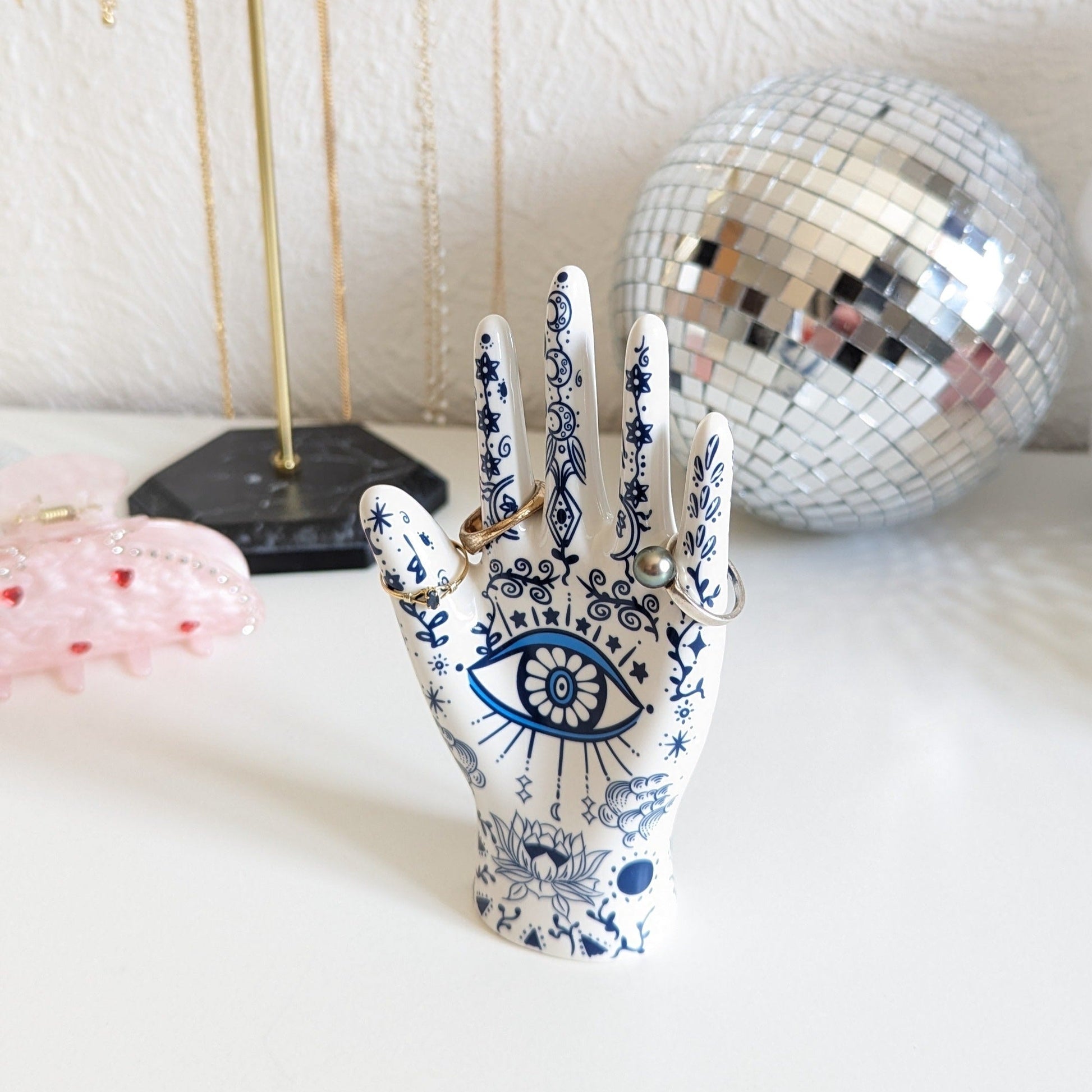 Depuis plus de deux millénaires, l’Œil de Fatma est un symbole puissant de protection, chance et bénédiction. Ce présentoir à bijoux en céramique allie spiritualité et praticité pour ranger vos bagues avec soin tout en ajoutant une touche mystique à votre décoration.