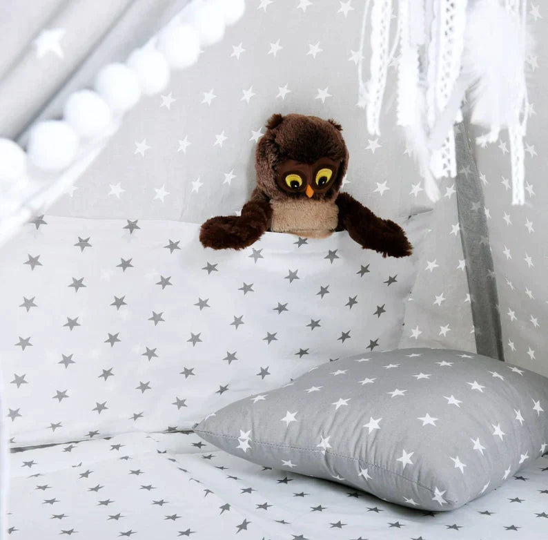 Le tissu gris orné d'étoiles blanches est à la fois élégant et amusant, stimulant l'imagination de votre enfant et lui offrant un lieu de repos idéal après une journée bien remplie.
